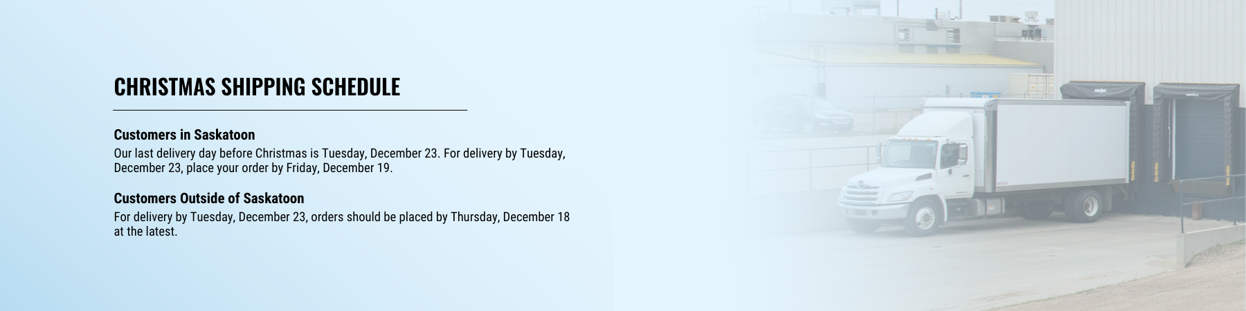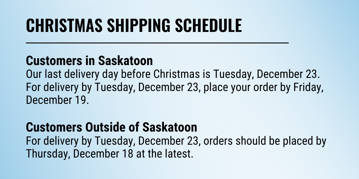 Place your order by 3pm on Dec 22 for shipment or Saskatoon delivery on Dec 23. The following shipping day is Dec 29. Contact customer service for details.