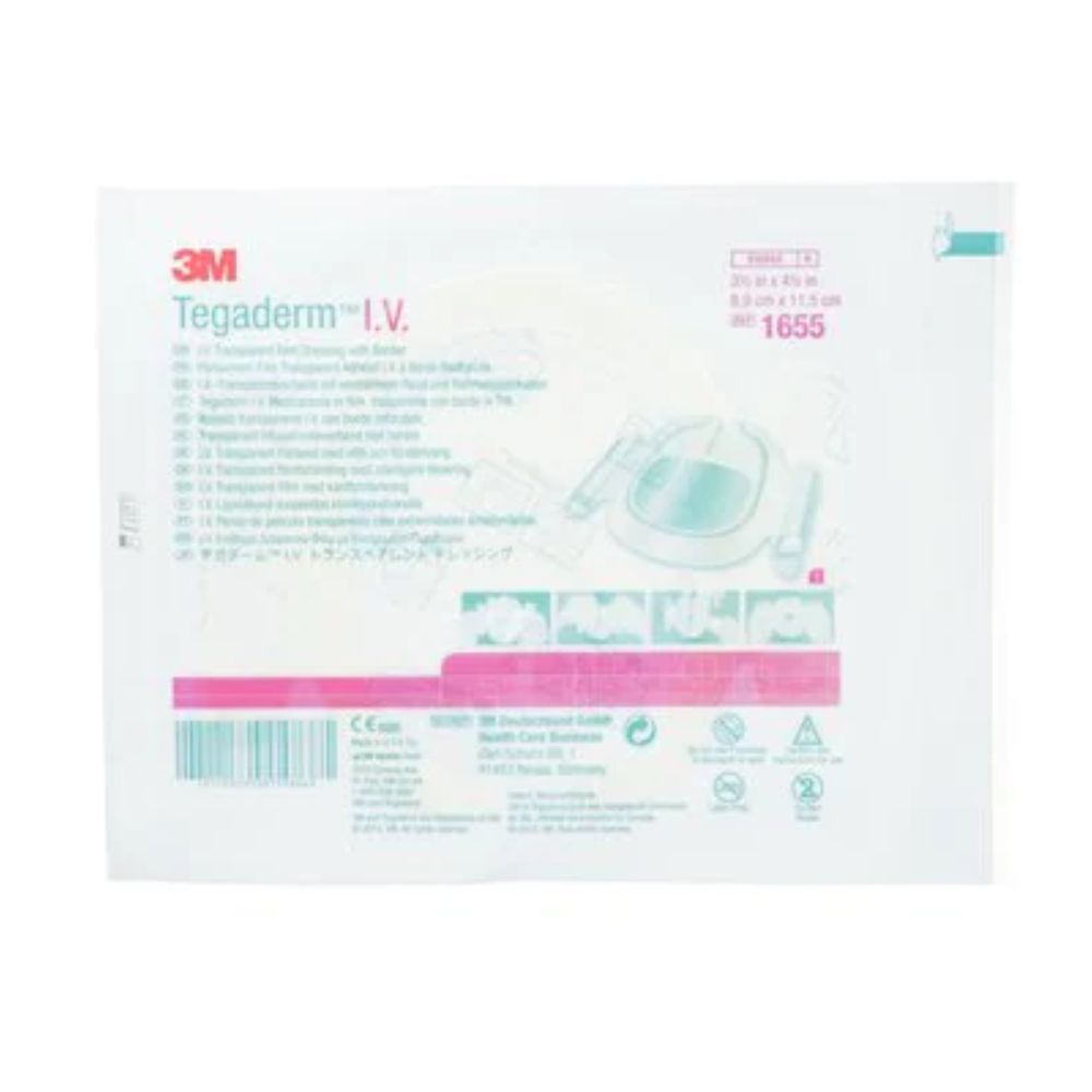 3M™ Tegaderm™ Transparent I.V. Film Dressings consist of a thin film backing with a hypoallergenic, latex-free adhesive that gently, yet securely, adheres to skin. 3M™ Tegaderm™ Transparent IV Film Dressings are breathable, sterile, transparent and waterproof, and provide a barrier to external contaminants. 3M™ Tegaderm™ Transparent I.V. Dressings are reinforced with soft cloth tape and provide a reliable protection for extended catheter security.