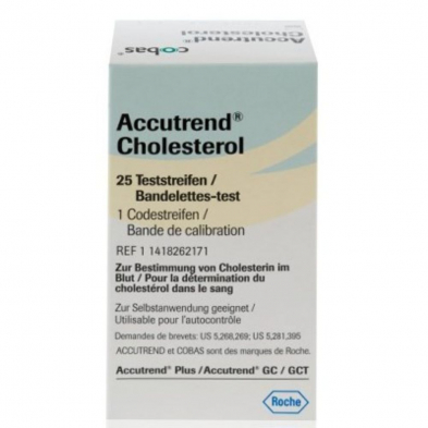 Accutrend Cholesterol test strips for use with the Accutrend Plus Glucose and Cholesterol Monitor. These test strips are suitable for self testing and are used to determine total cholesterol levels in the blood.