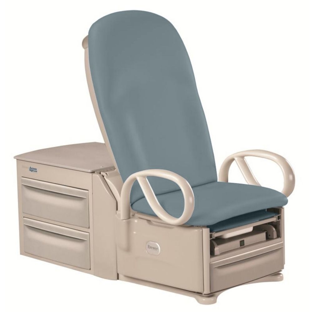 Brewer’s Access™ High-Low Exam Table design provides an 18″ profile in the seated position. This allows safe level patient transfer from standard wheelchair heights, complete with upright seat back and safety grab bars to simplify reliable patient transfers. The Access power medical table system also offers abundant storage capacity with Brewer’s signature pass-through drawer system and it’s backed by Brewer’s standard 3-year warranty. Choose between the standard Access power exam table’s 500 pound weight capacity or the Access High-Low Exam Table 700 with 700 pound weight capacity for geriatric patients.