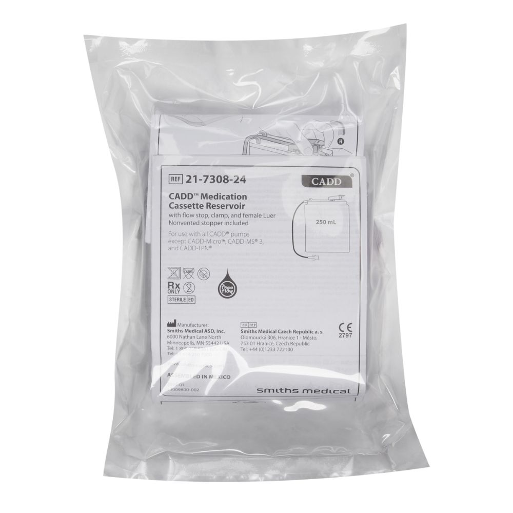 250 mL clear CADD medication cassette reservoir with flow stop, clamp, female luer and non-vented cap, 8" tubing.