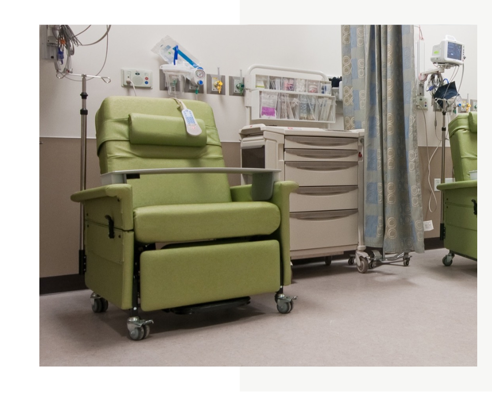 Champion’s 56 Series recliner is generously sized, deeper and wider, with a steel frame reinforced to meet the needs of patients up to 500 pounds. Durable five-inch casters roll easily during transport and raise the chair to a comfortable height for staff, and the extra room is great for nocturnal therapies. The 56 Series is ideal for pre- and post-operation, dialysis and other treatment needs.