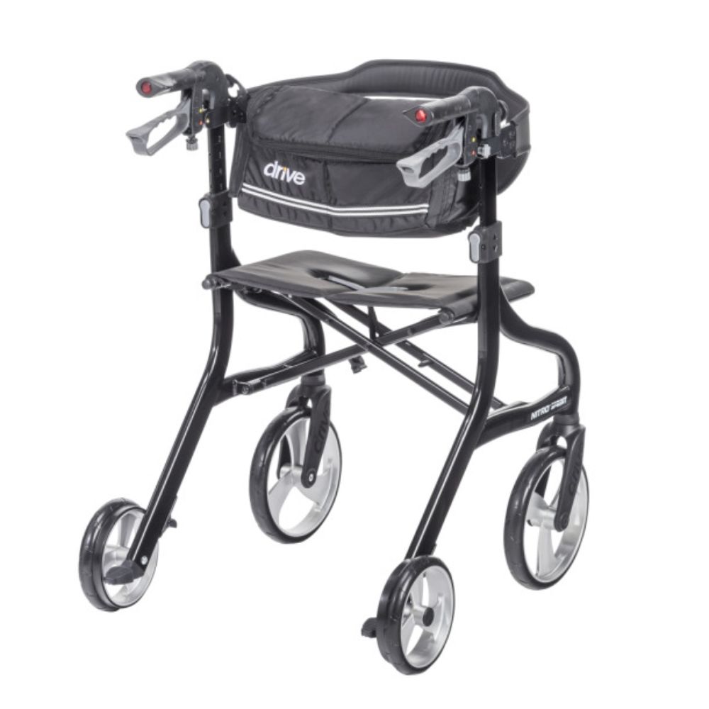 The sleek Nitro Sprint Rollator is designed to provide comfort, convenience, and control at every turn. The rollator sports a unique braking system that reduces tire wear and an integrated slow-down brake for safer maneuverability over diverse terrain. When not in use, the rollator can be folded side to side with one hand and locked in place for easy transport. Other features include multiple storage bag mounting points and a wider backrest with a window for improved comfort and visibility.