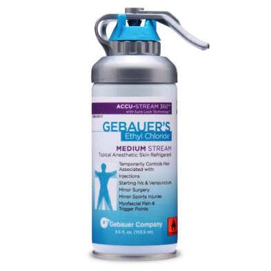 Gebauer's Ethyl Chloride® instant topical anesthetic spray (vapocoolant) is FDA cleared to temporarily control the pain associated with injections, starting IV's and venipuncture, minor surgical procedures and minor sports injuries.