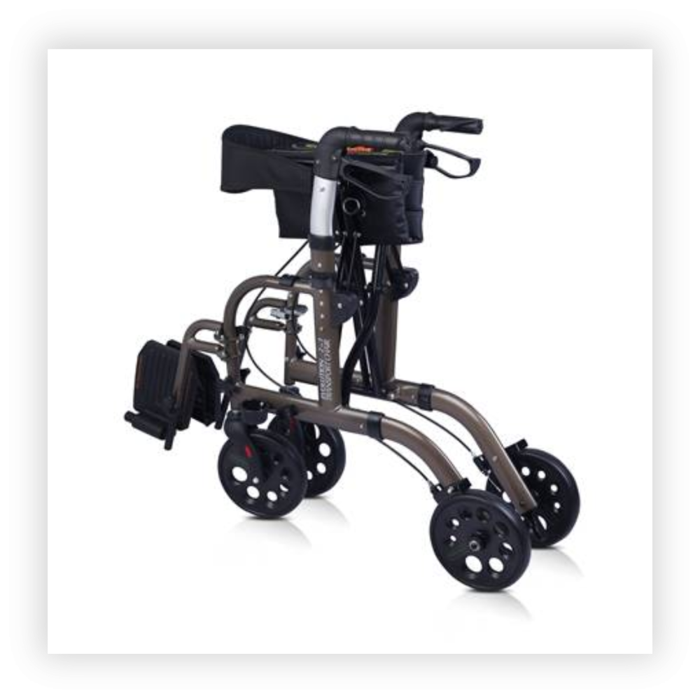 The transport chair combines both a walker and wheelchair into one easy-to-use unit.