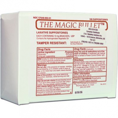 The Magic Bullet ™ is a better alternative to other suppositories, as it is faster acting, safe and sure 10 mg Bisacodyl suppository. It is designed to help those with bowel incontinence to minimize the cost and excessive time involved in most bowel programs. It is water based, not oil based as other suppositories, which causes the Bisacodyl to totally disperse within minutes after insertion.