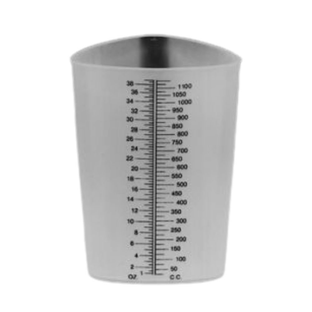 Rigid-walled container with triangular shaped body. Large, easy-to-read graduations to 1000 cc's and 32 ozs. Frosted panel on one side for patient information. Rolled lip allows drip-free pouring. Disposable.
