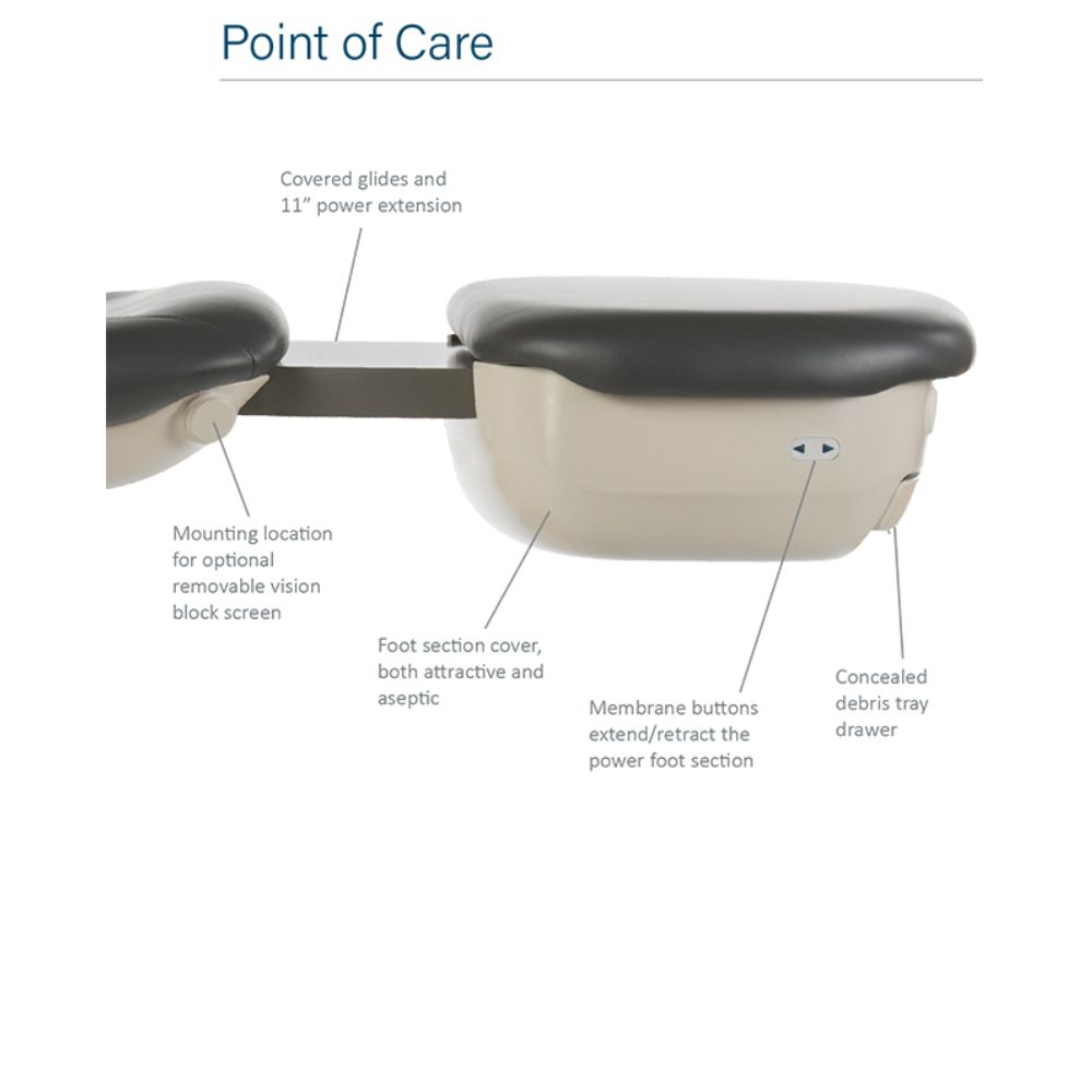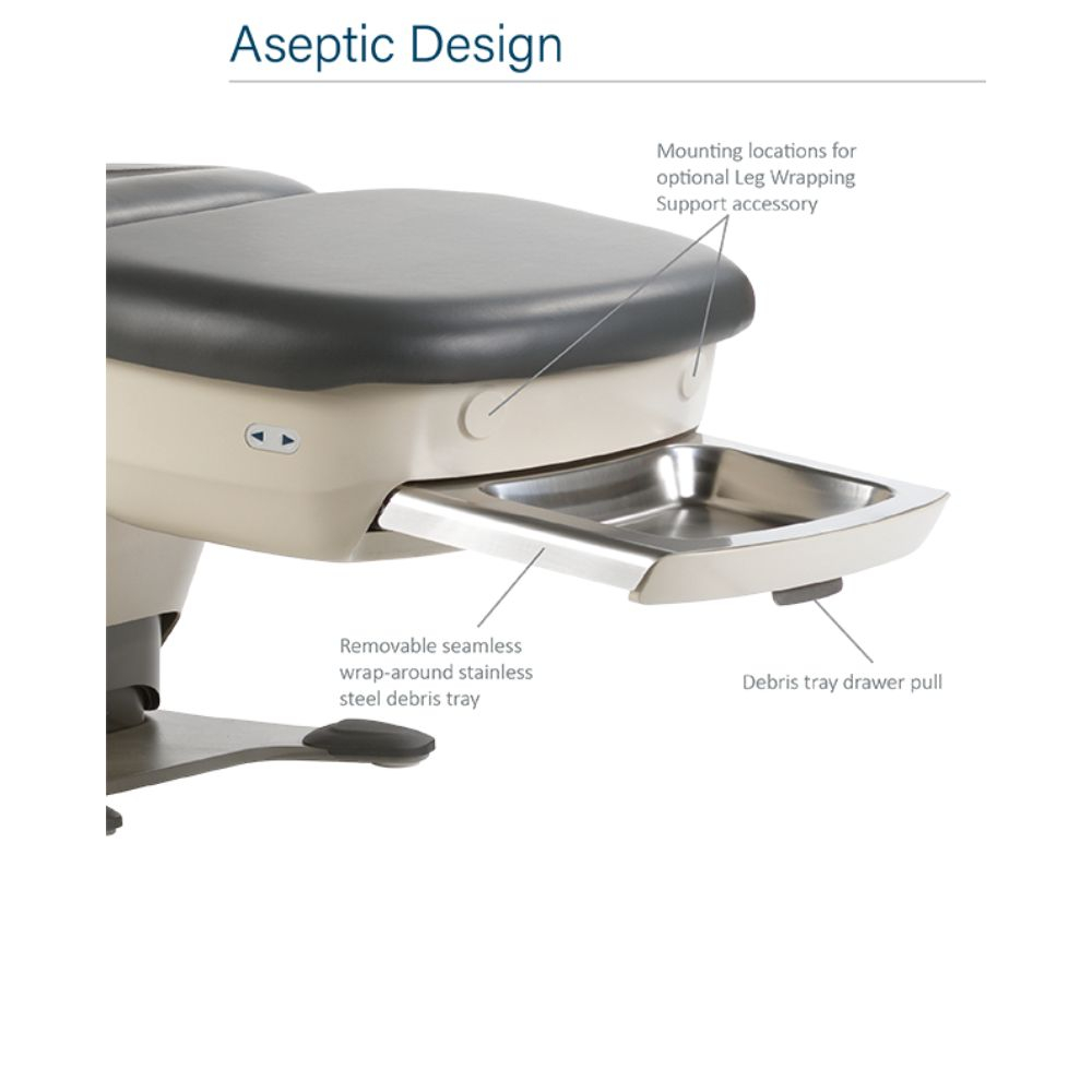 The MTI 529 Podiatry & Wound Care Chair is ADA compliant and designed for easy patient ingress/egress and equal accessibility. This chair features a redesigned non-knee break powered foot section with a pull-out stainless steel debris tray. With a high patient weight capacity of 725 lbs and advanced SmartTech™ and ComfortSync™ technologies, MTI delivers optimal luxury, comfort, and safety. Upgrade your podiatry and wound care practice with the MTI 529 Podiatry & Wound Care Chair, designed to enhance patient experiences and provide exceptional accessibility.