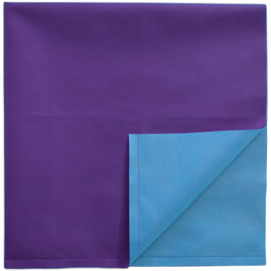 Material layers of the Fused Two Colour wrap are interchangeable with equal material strength, durability, and softness. Either the purple or blue material can face the outside of the wrapped package. For consistency in package colours, the purple layer is recommended as the standard outside-facing material.