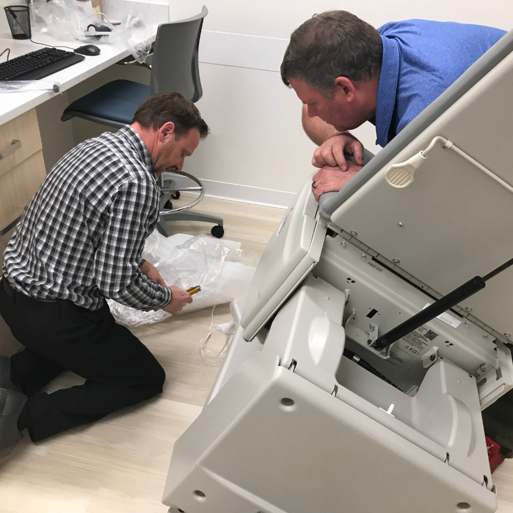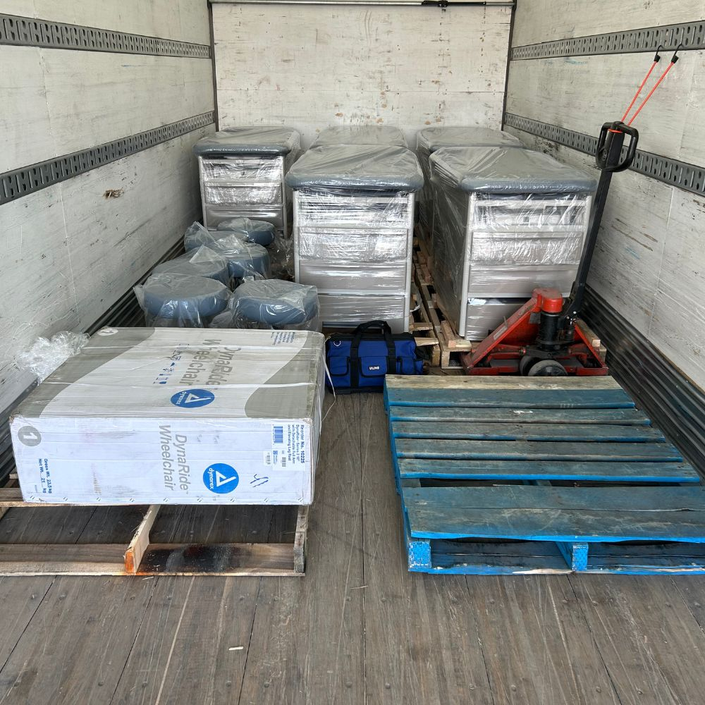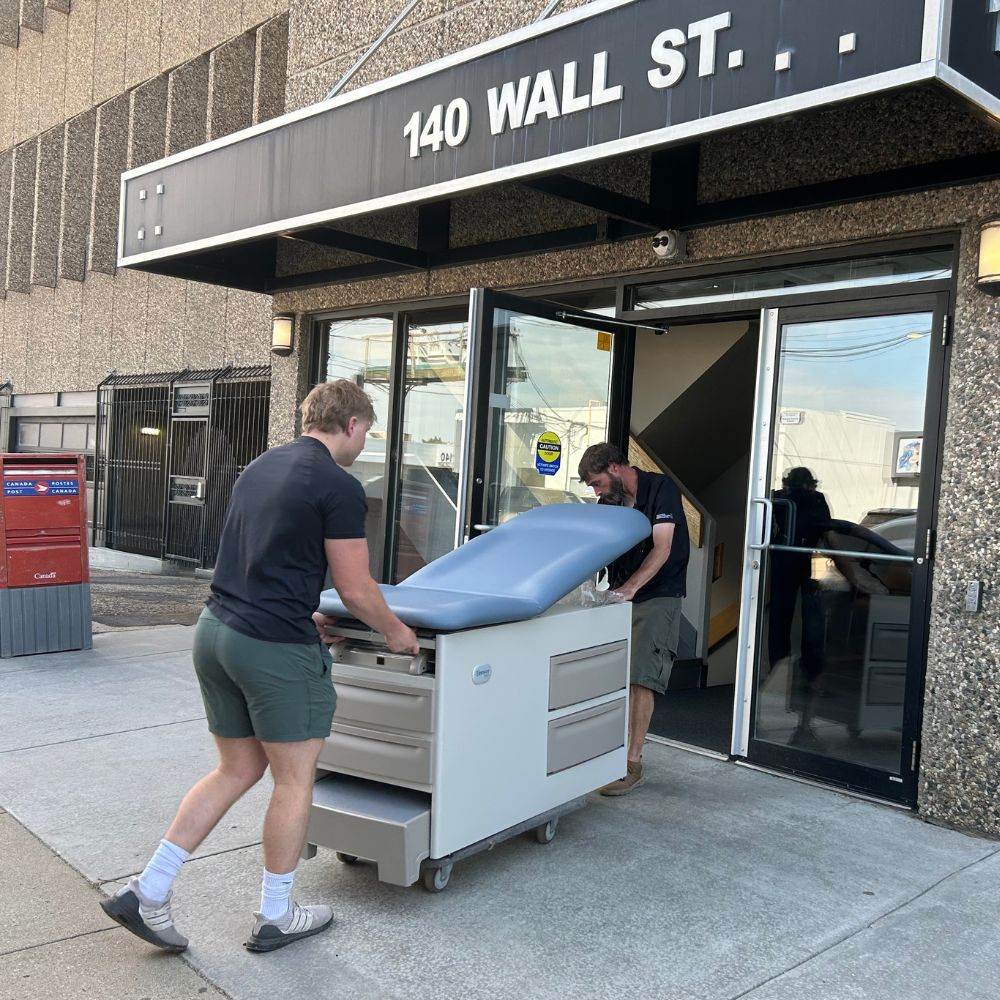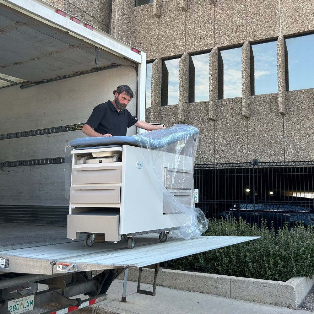 Staff members delivered medical equipment and instruments to Moose Jaw with our delivery truck. This included items such as exam tables, exam stools, procedure chairs, procedure ceiling lights, autoclaves, diagnostic wall systems, utility carts, AEDs, adult and pediatric scales, and wheelchairs. They unloaded, unwrapped, and arranged the pieces into 17 different rooms in the clinic.