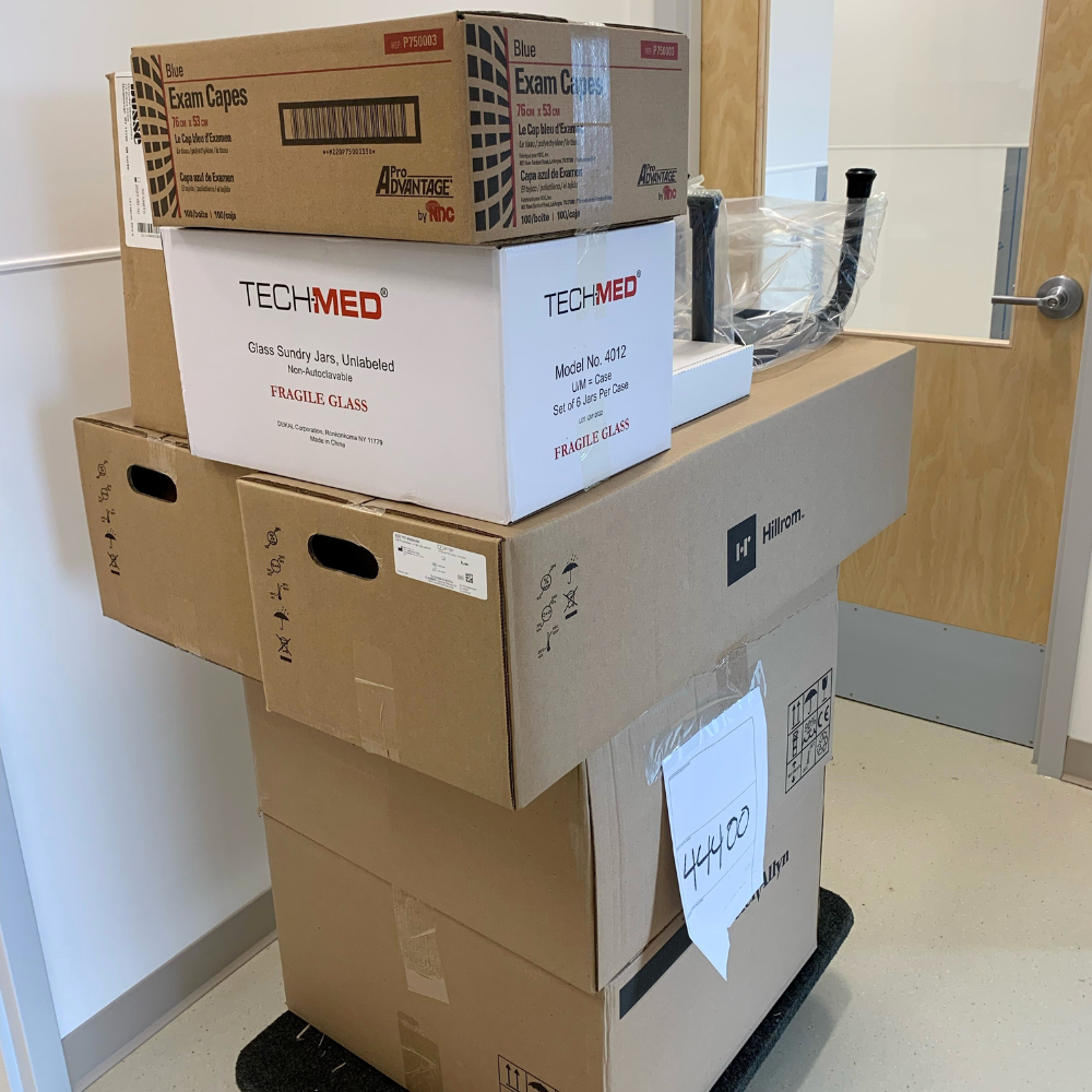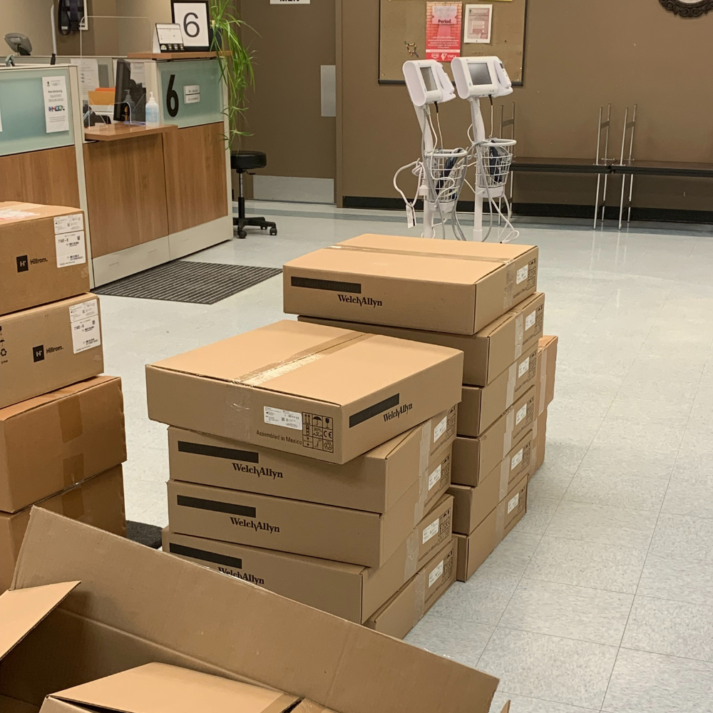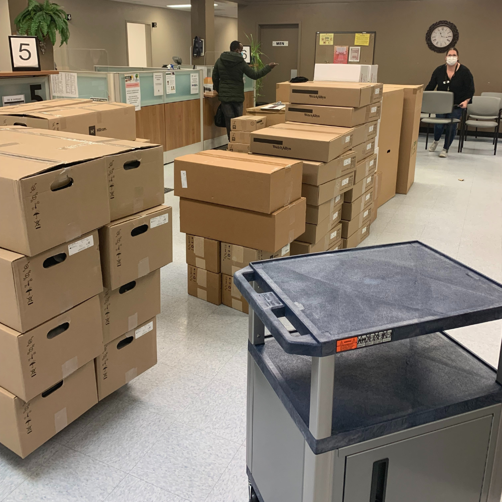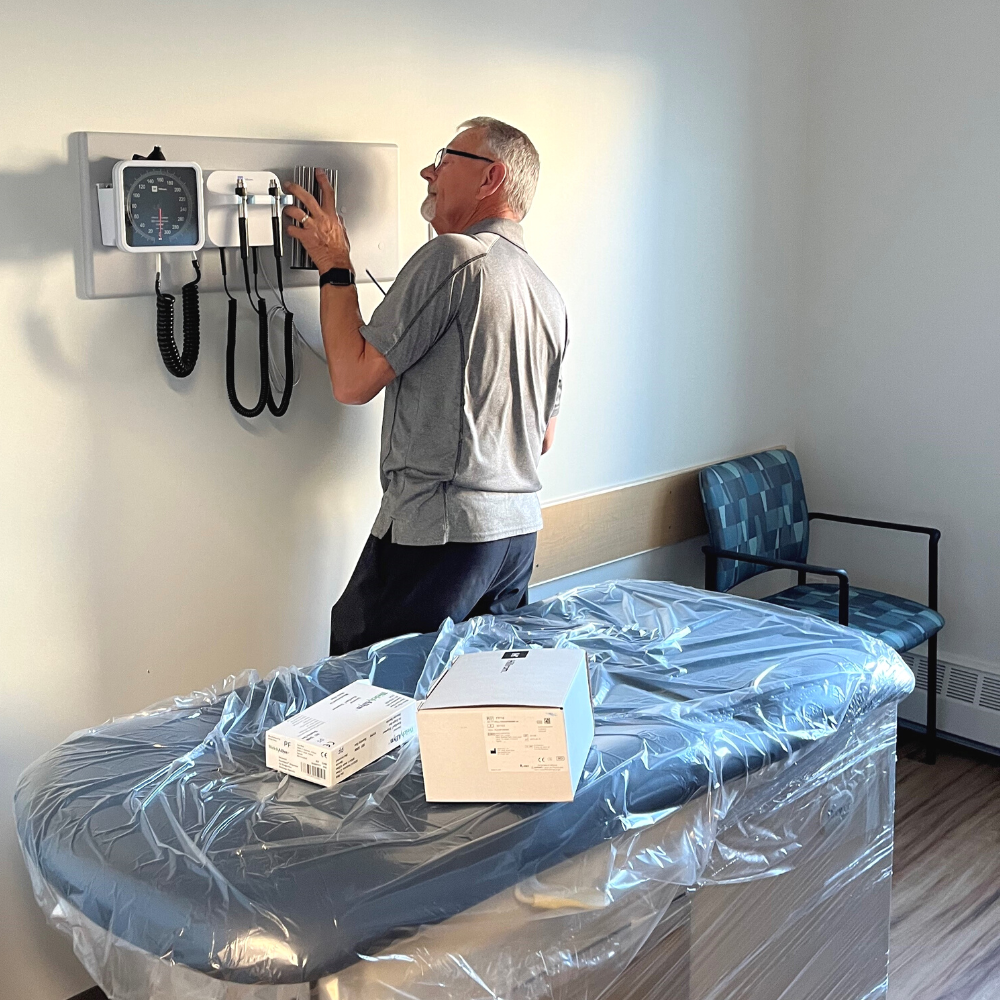 Our staff delivered equipment to a brand-new medical clinic in Saskatoon. A total of 97 items were delivered, including exam tables and stools, exam lights, diagnostic sets, floor scales, hand sanitizer and hand wash dispensers, wheelchairs, crutches, blood pressure devices, dopplers, and stethoscopes. Although construction was still underway, we kept the project on schedule by assembling what we could and then returning once construction was complete to set up the rest. We also ensured the site was left clean by disposing of all boxes and packaging materials.