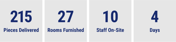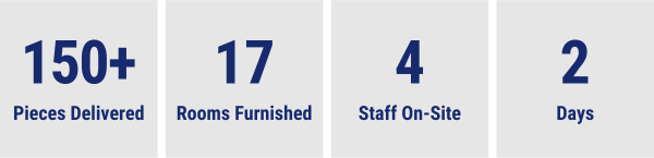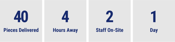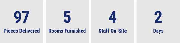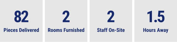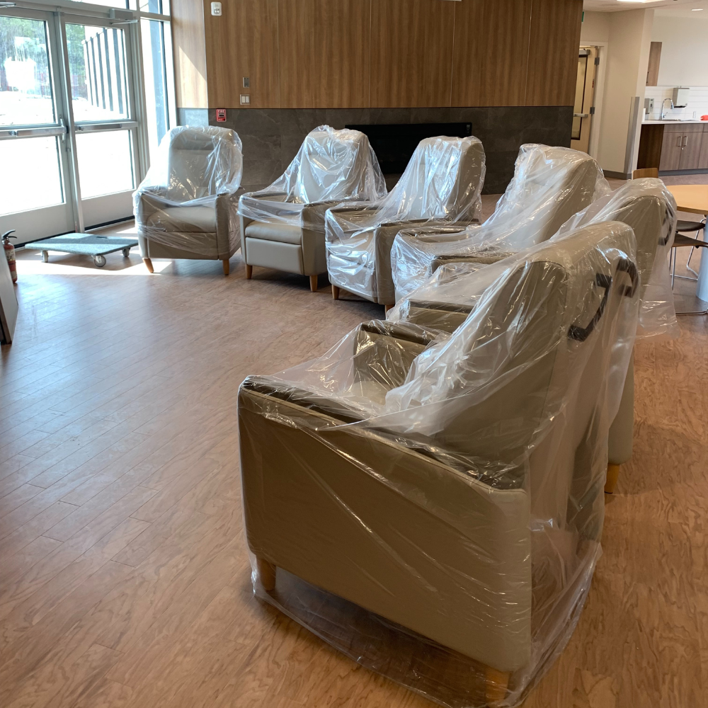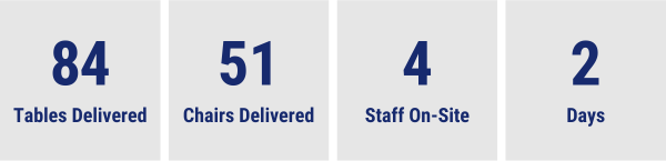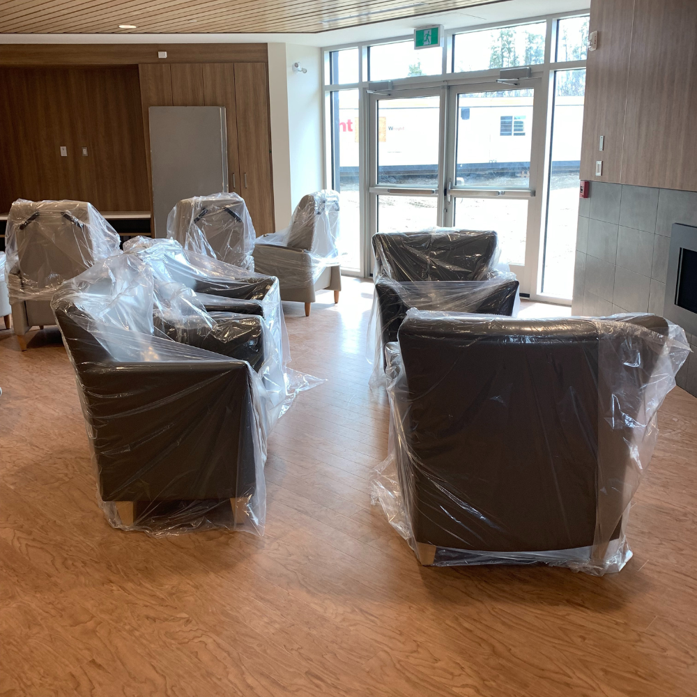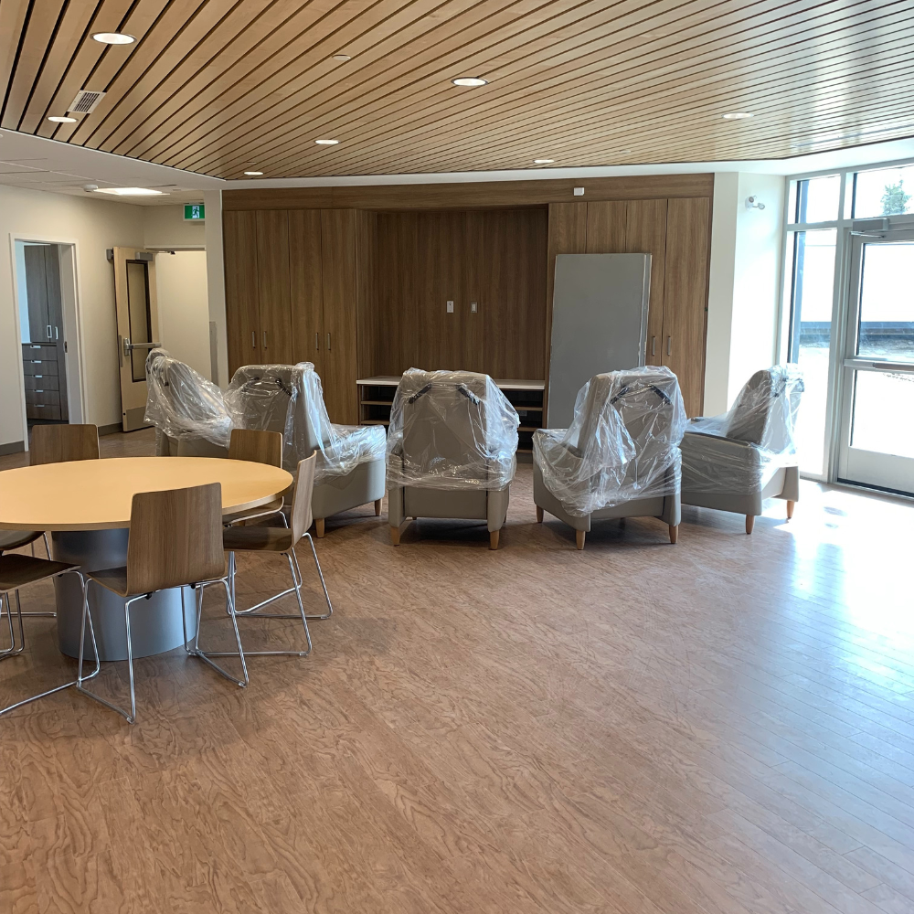 Our staff delivered, unpacked, and set up furniture at a nursing home in Prince Albert. A total of 135 items were delivered, including dining tables, stacking arm chairs, and overbed tables.