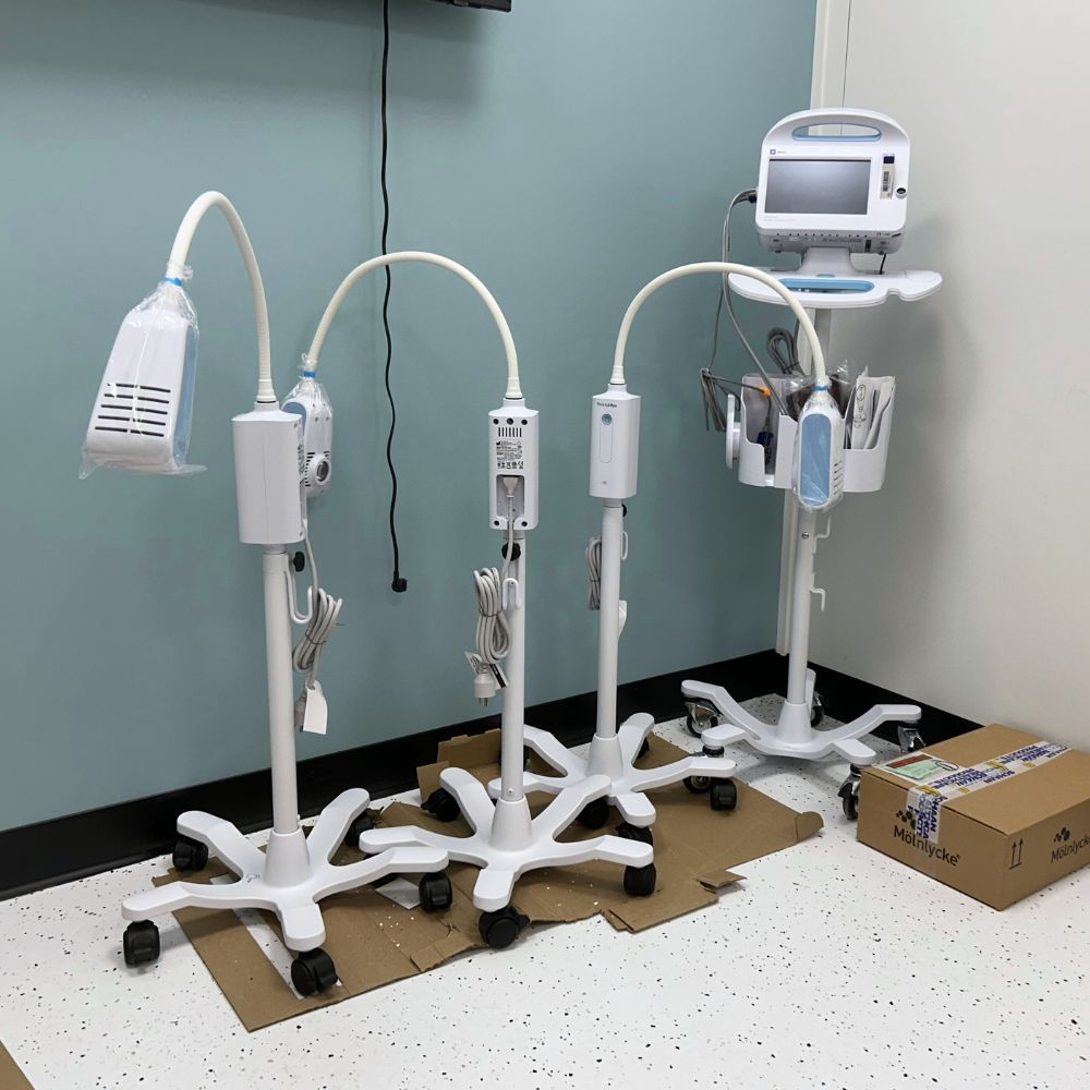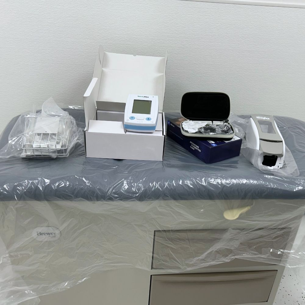 Exam tables, diagnostic sets, exam lights, blood pressure monitors, autoclaves, ECGs and hand sanitizer dispensers were delivered, unpacked, and installed at the brand new Cornerstone Medical Clinic in Stonebridge. Our team setup 13 rooms in the clinic from the ground up with MOA stations equipped and ready to go for their opening day. The clinic recently expanded in 2022 and our staff delivered and installed equipment in the additional 2 rooms.