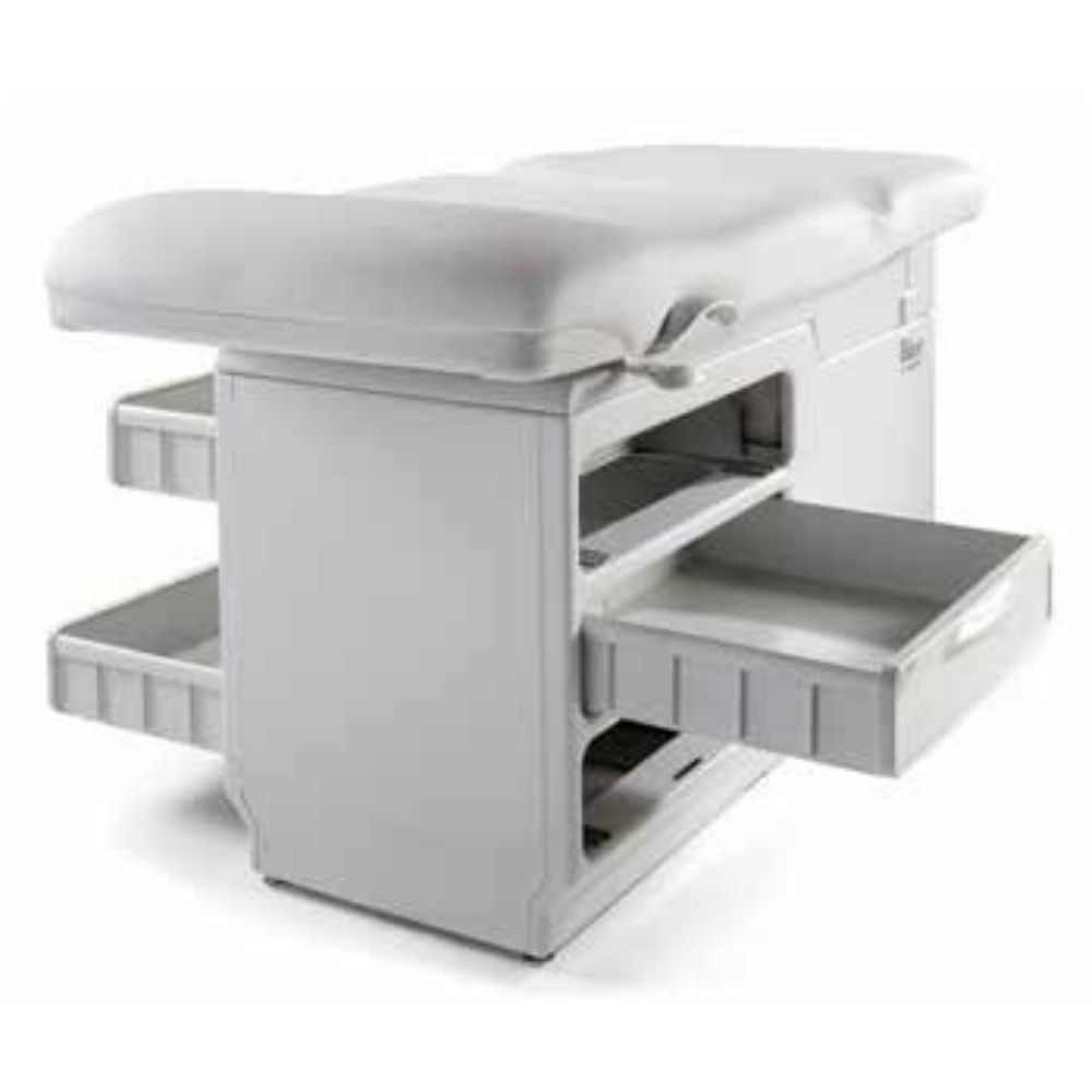 Three side drawers provide point of care storage for gowns, drapes and other large items, as well as organized storage for smaller supplies and bulk items. Two front drawers provide easy access to items during lower body exams.