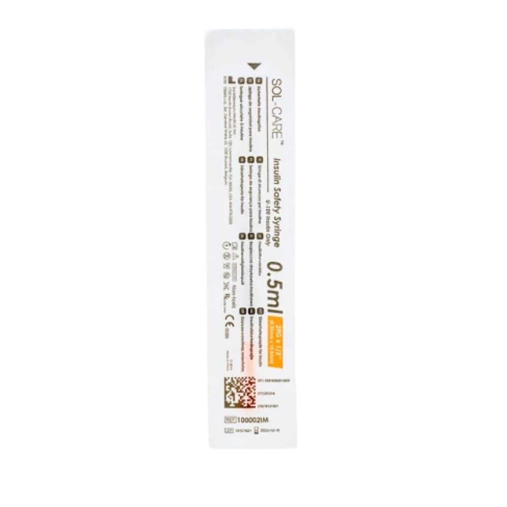 The Sol-Care Safety Insulin Syringe provides accurate and comfortable insulin administration. Its retractable needle helps to prevent needlestick injuries.