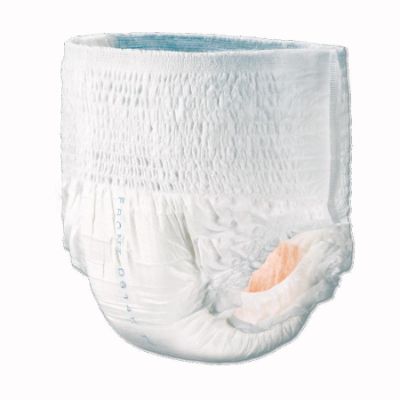 Tranquility® Premium OverNight™ Disposable Absorbent Underwear provide maximum capacity for uninterrupted sleep. Larger sizes hold over 1 qt of fluid. The peach core guarantees skin dryness, odor reduction and urine pH neutralization. Clothlike outer layer with breathable sides and an ample, full-rise waist panel provide a more proportioned fit. Kufguards® (inner leg cuffs) channel fluids into the core, helping to contain high-volume urge episodes and bowel incontinence. Tear-away side seams allow for easy removal. Blue leg elastics indicate overnight protection. Latex-free.